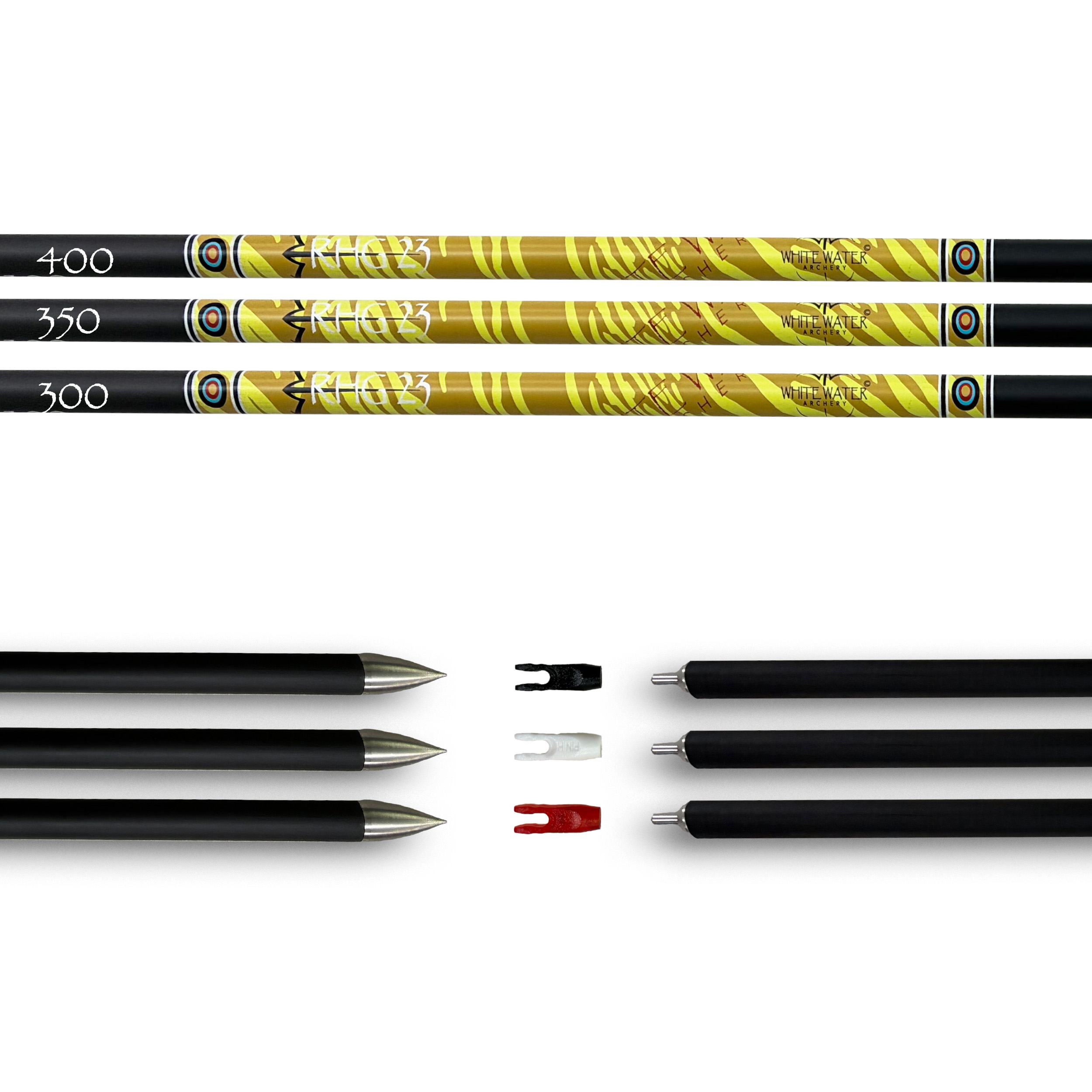 The White Water Archery RHG 23 arrow is our first 23/64″ target arrow. These are the largest diameter arrows allowed for World Archery and USA Archery competitions. Built for the shooter that is looking to get them most out of his scores in competition. The larger diameter cuts lines when close, but the lightweight construction allows for a faster flatter shooting arrow. Need more speed out of your competition setup? These arrows will be an integral part of providing that extra speed.